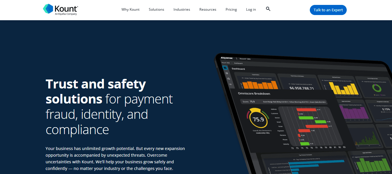 Kount uses adaptive analytics and risk scoring to detect fraud, verify identity, and reduce false positives across enterprise transactions.
